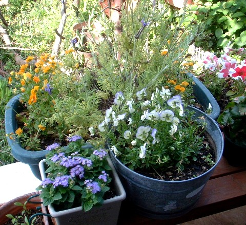 手前左がアゲラタム、右はビオラ。