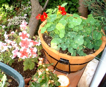 左がペチュニア、手前中央がリーガースベゴニア、右上がナスタチウム。